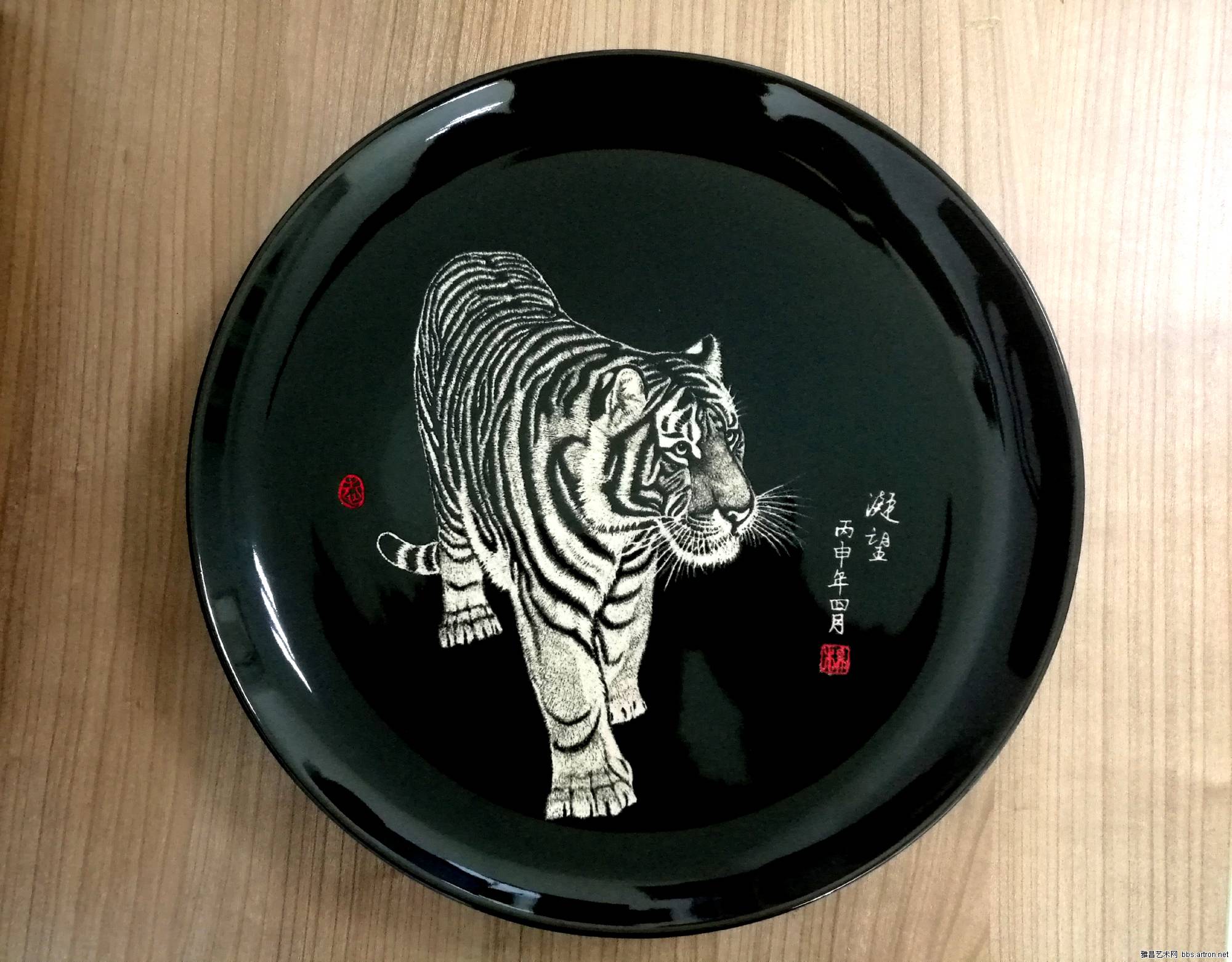 客戶定制 黑色釉手繪白虎陶瓷紀念盤